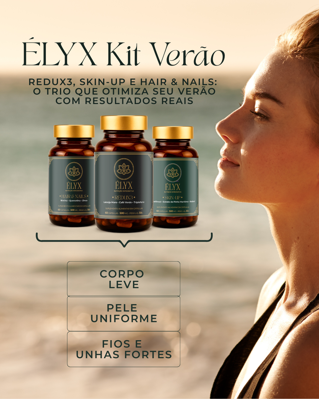 Combinando ciência, sensibilidade e ingredientes de alta performance, os Kits ÉLYX apoiam sua jornada com sofisticação e equilíbrio — do metabolismo à pele, dos hormônios à vitalidade.